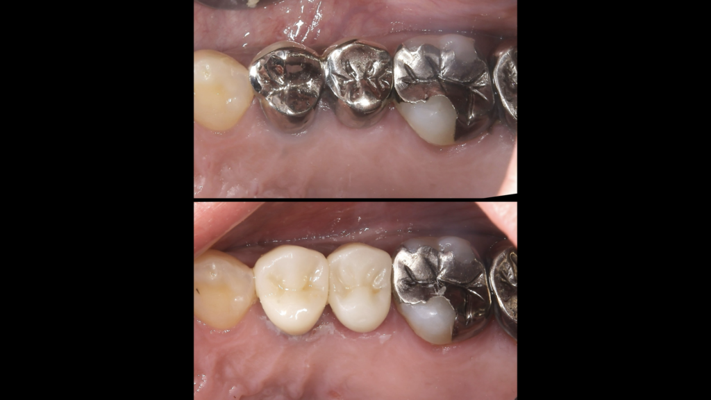 上の奥歯の銀の被せ物をセラミックにて処置を行いました。